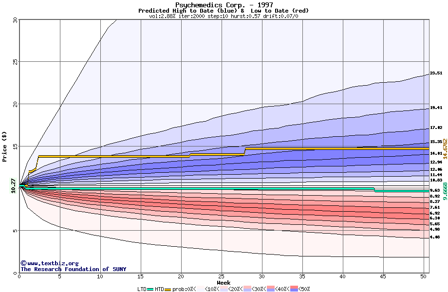 The high to date and low to date prices of the stock plotted against a random walk model for 1997 (what's this?).