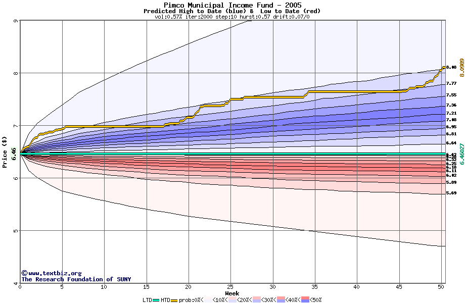 The high to date and low to date prices of the stock plotted against a random walk model for 2005 (what's this?).