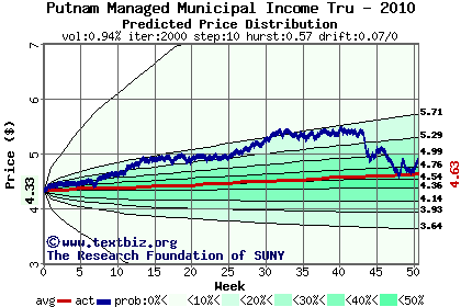 The high to date and low to date prices of the stock plotted against a random walk model for 2010 (what's this?).