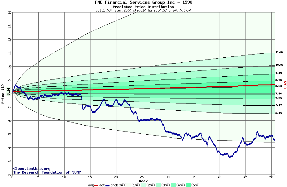 The following graph plots the year-to-date performance of the stock for 1990 compared to the probability calculated by a random walk model.