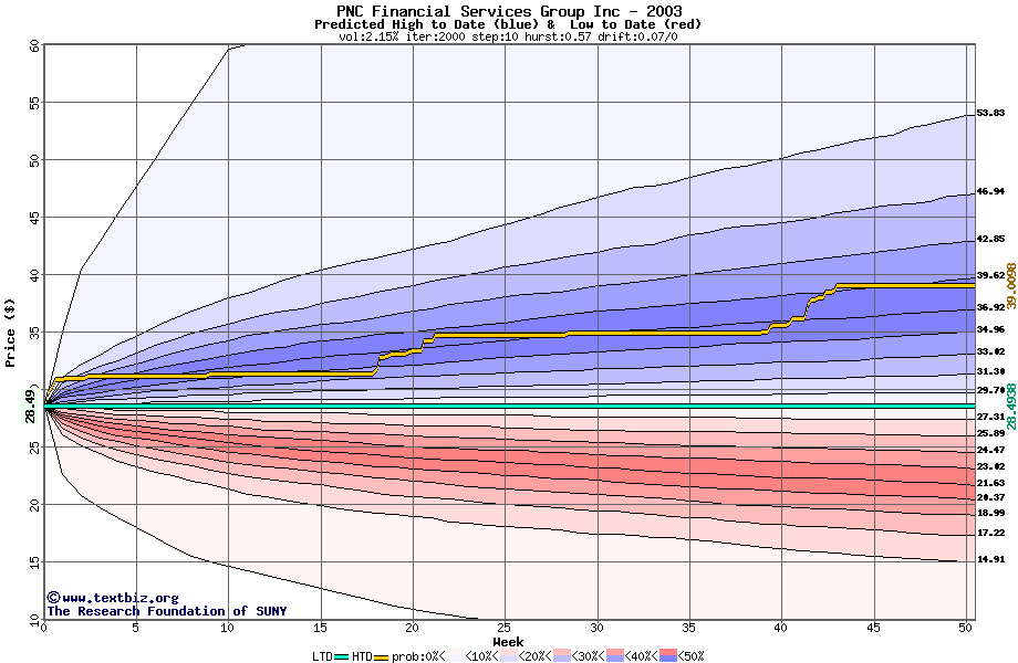 The high to date and low to date prices of the stock plotted against a random walk model for 2003 (what's this?).