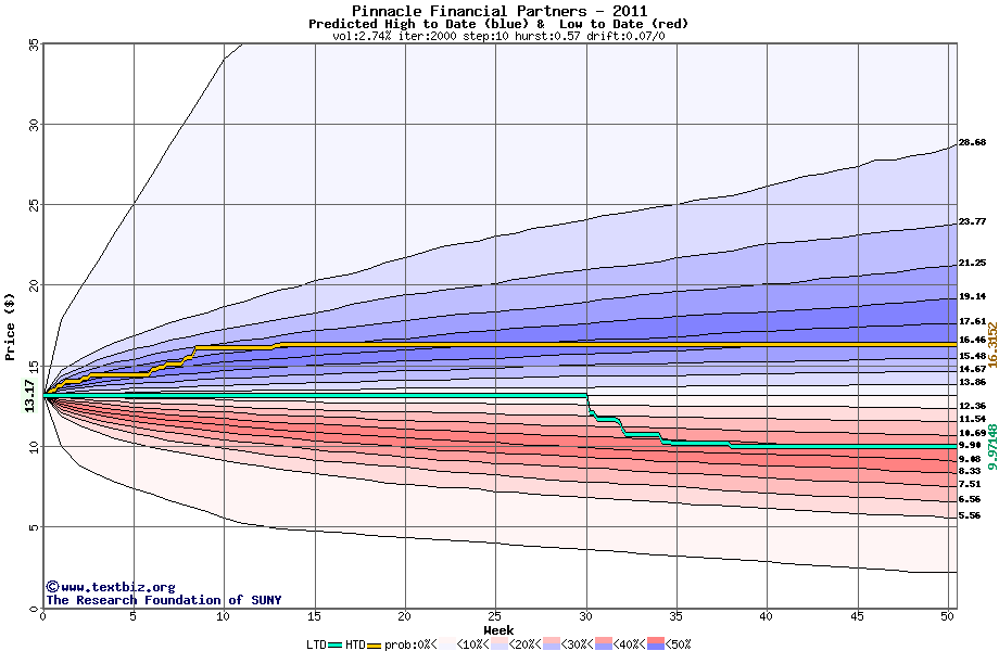 The high to date and low to date prices of the stock plotted against a random walk model for 2011 (what's this?).