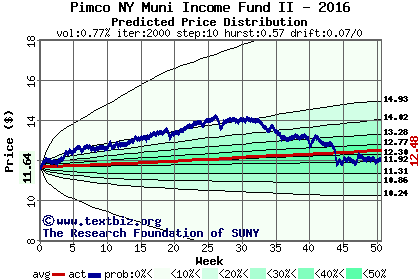The high to date and low to date prices of the stock plotted against a random walk model for 2016 (what's this?).