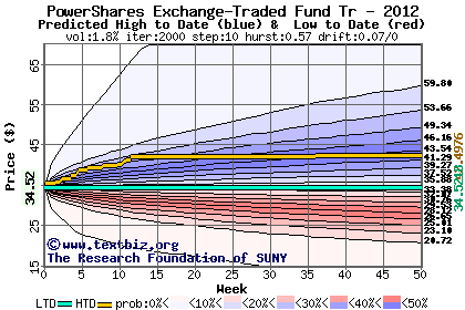 The high to date and low to date prices of the stock plotted against a random walk model for 2012 (what's this?).