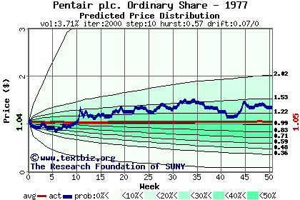 The high to date and low to date prices of the stock plotted against a random walk model for 1977 (what's this?).