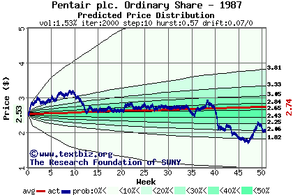 The high to date and low to date prices of the stock plotted against a random walk model for 1987 (what's this?).