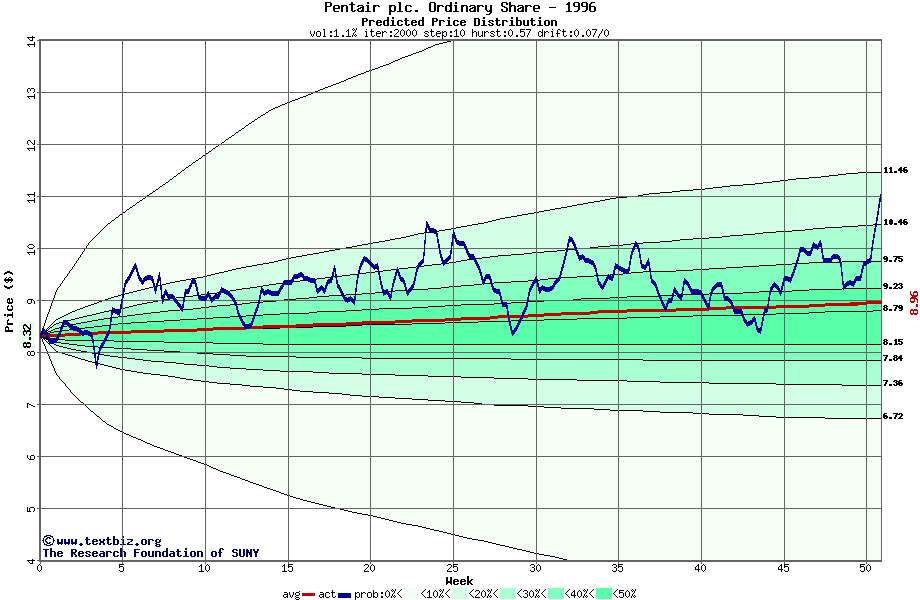 The following graph plots the year-to-date performance of the stock for 1996 compared to the probability calculated by a random walk model.