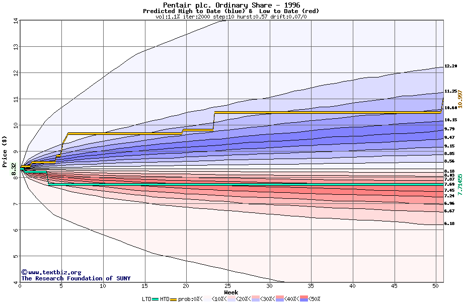 The high to date and low to date prices of the stock plotted against a random walk model for 1996 (what's this?).