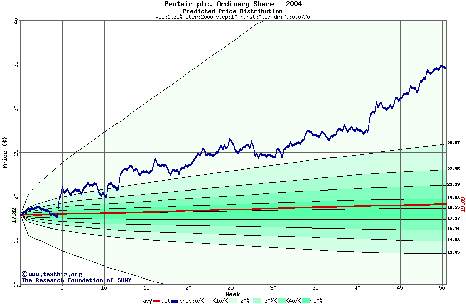 The following graph plots the year-to-date performance of the stock for 2004 compared to the probability calculated by a random walk model.