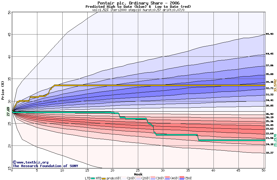 The high to date and low to date prices of the stock plotted against a random walk model for 2006 (what's this?).