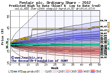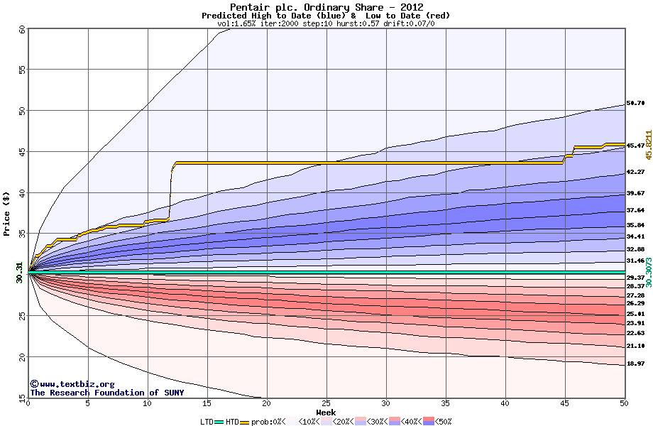 The high to date and low to date prices of the stock plotted against a random walk model for 2012 (what's this?).