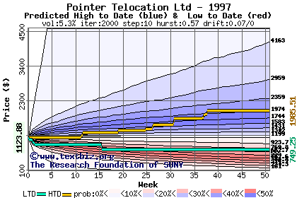 The high to date and low to date prices of the stock plotted against a random walk model for 1997 (what's this?).