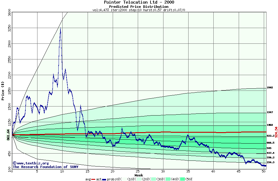 The high to date and low to date prices of the stock plotted against a random walk model for 2000 (what's this?).