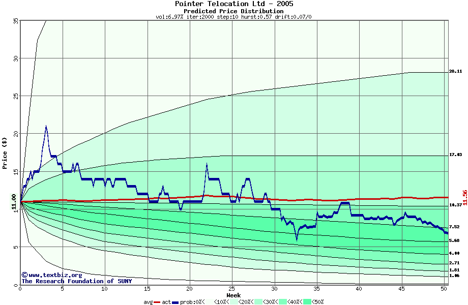 The following graph plots the year-to-date performance of the stock for 2005 compared to the probability calculated by a random walk model.