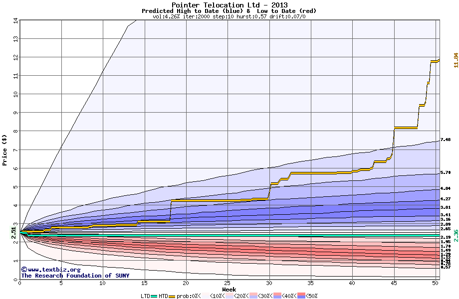The following graph plots the year-to-date performance of the stock for 2013 compared to the probability calculated by a random walk model.
