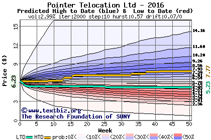 The high to date and low to date prices of the stock plotted against a random walk model for 2016 (what's this?).