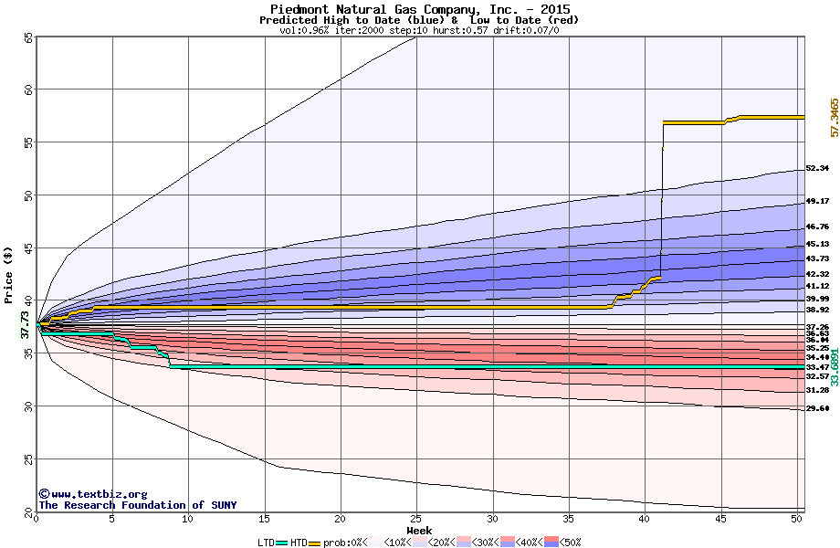 The high to date and low to date prices of the stock plotted against a random walk model for 2015 (what's this?).