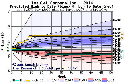 The high to date and low to date prices of the stock plotted against a random walk model for 2014 (what's this?).