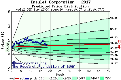 The high to date and low to date prices of the stock plotted against a random walk model for 2017 (what's this?).