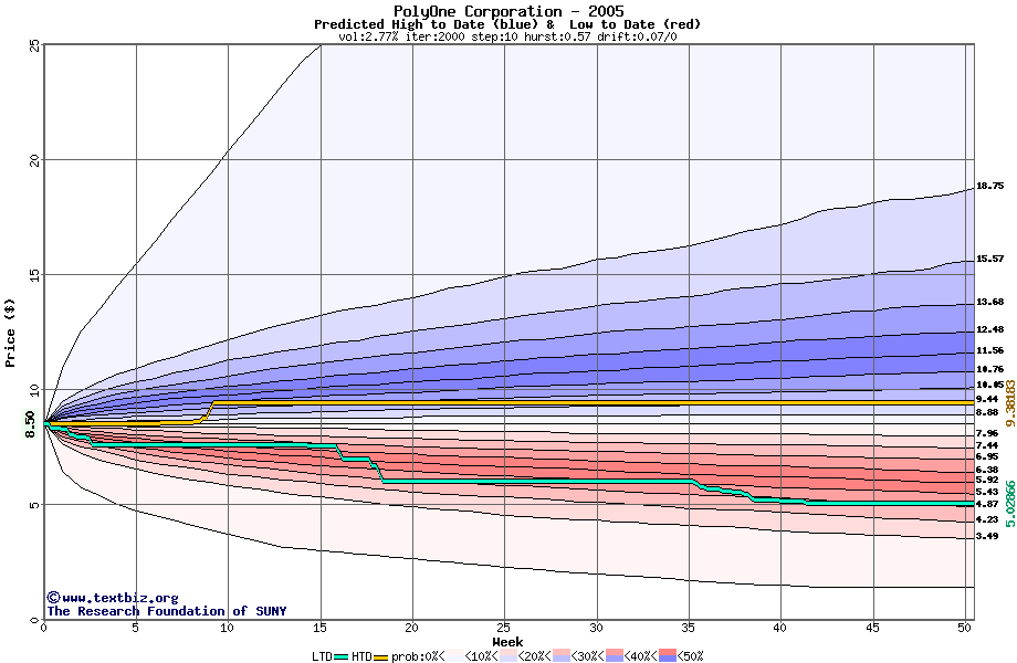The high to date and low to date prices of the stock plotted against a random walk model for 2005 (what's this?).
