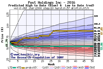The high to date and low to date prices of the stock plotted against a random walk model for 2016 (what's this?).
