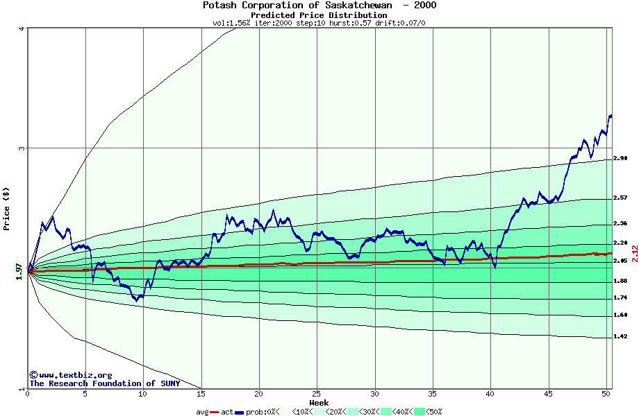 The high to date and low to date prices of the stock plotted against a random walk model for 2000 (what's this?).