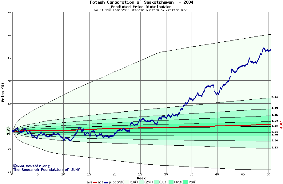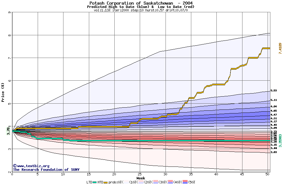 The high to date and low to date prices of the stock plotted against a random walk model for 2004 (what's this?).
