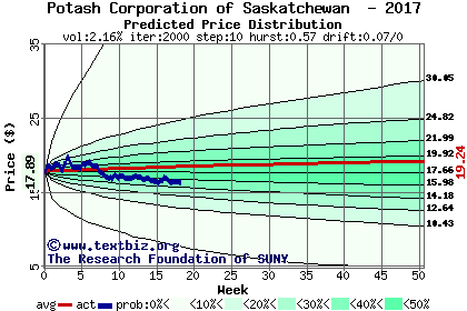 The high to date and low to date prices of the stock plotted against a random walk model for 2017 (what's this?).