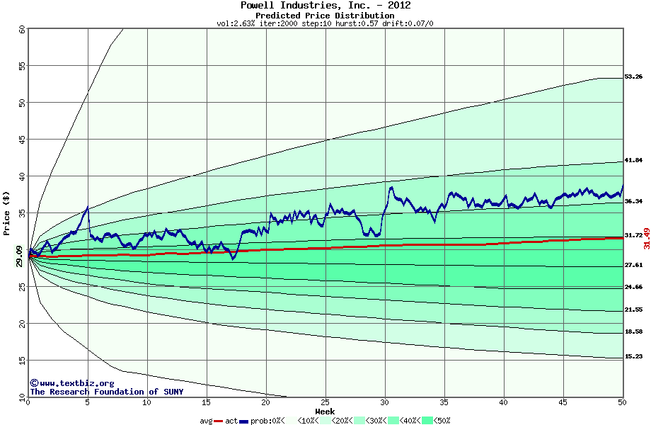 The following graph plots the year-to-date performance of the stock for 2012 compared to the probability calculated by a random walk model.