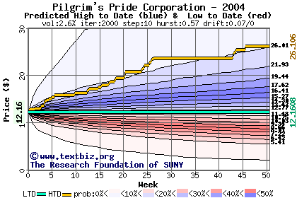 The high to date and low to date prices of the stock plotted against a random walk model for 2004 (what's this?).