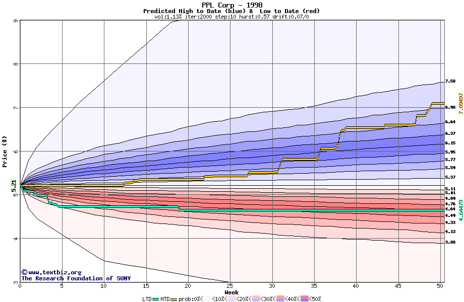 The high to date and low to date prices of the stock plotted against a random walk model for 1998 (what's this?).