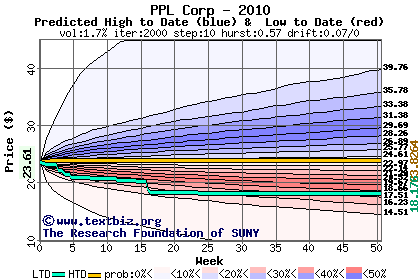 The high to date and low to date prices of the stock plotted against a random walk model for 2010 (what's this?).