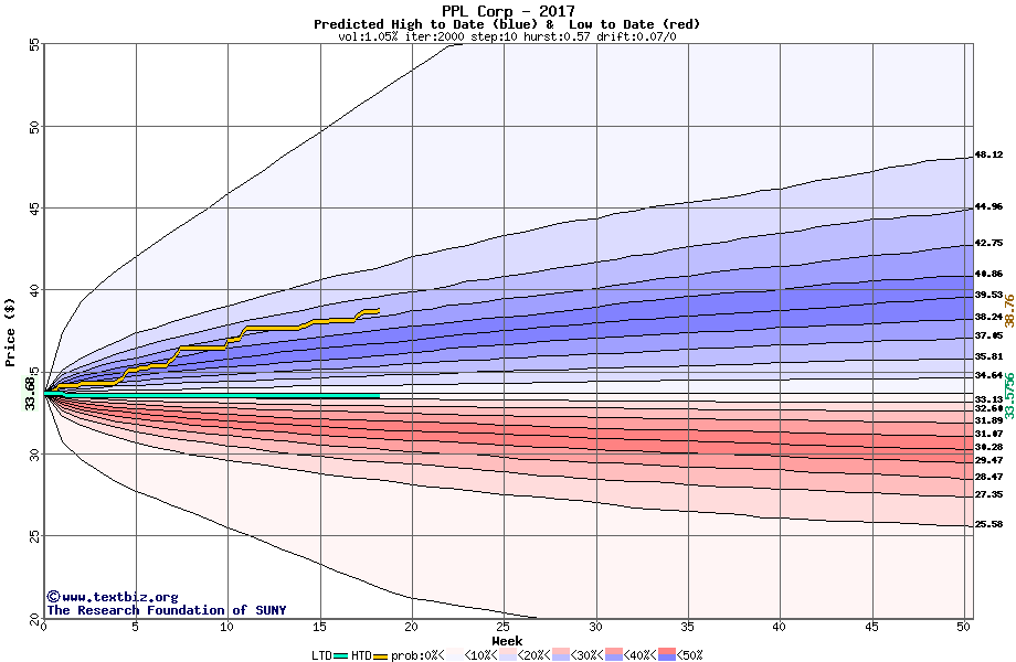 The high to date and low to date prices of the stock plotted against a random walk model for 2017 (what's this?).