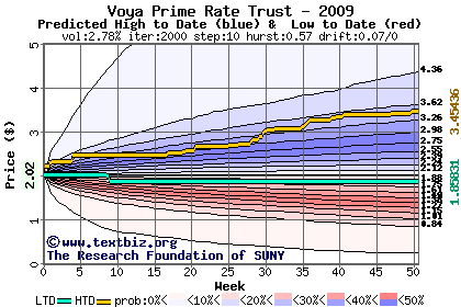 The high to date and low to date prices of the stock plotted against a random walk model for 2009 (what's this?).