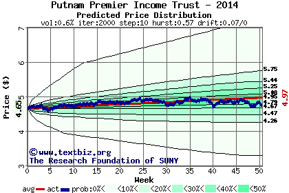 The high to date and low to date prices of the stock plotted against a random walk model for 2014 (what's this?).