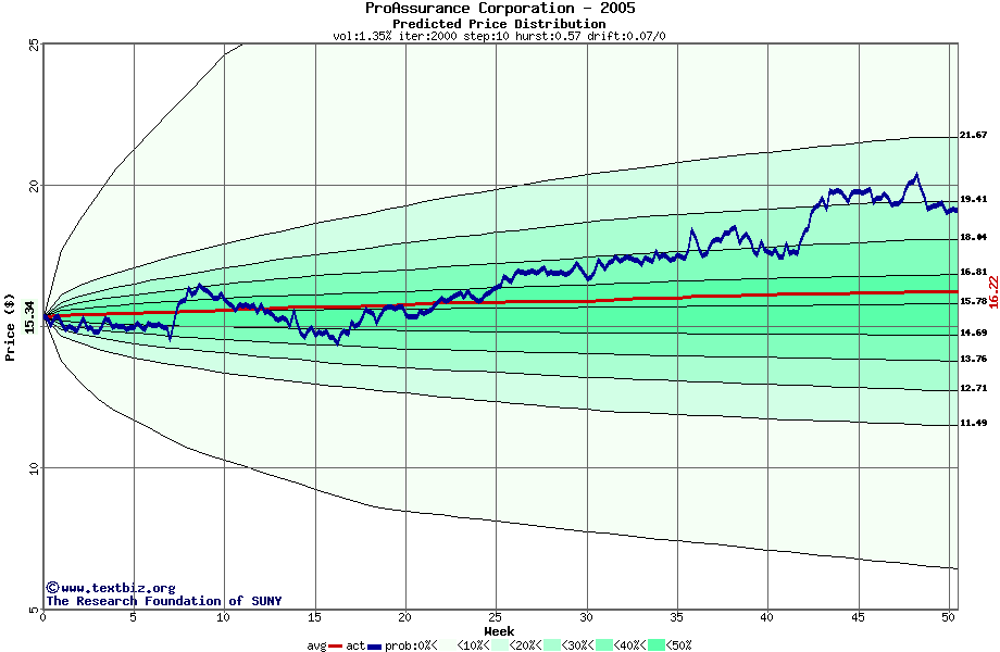 The following graph plots the year-to-date performance of the stock for 2005 compared to the probability calculated by a random walk model.