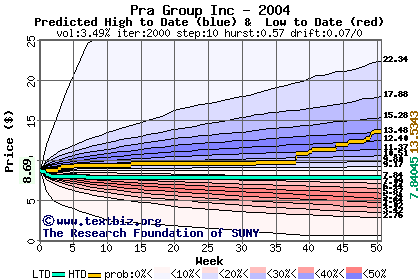 The high to date and low to date prices of the stock plotted against a random walk model for 2004 (what's this?).