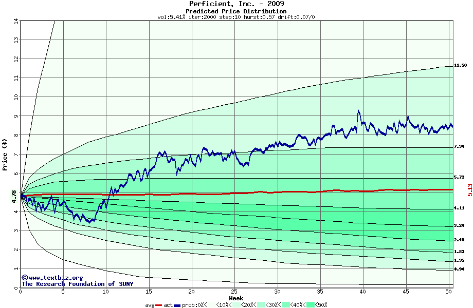 The following graph plots the year-to-date performance of the stock for 2009 compared to the probability calculated by a random walk model.