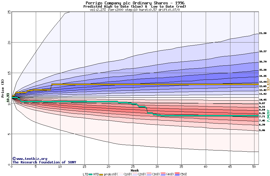 The high to date and low to date prices of the stock plotted against a random walk model for 1996 (what's this?).