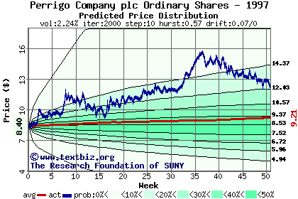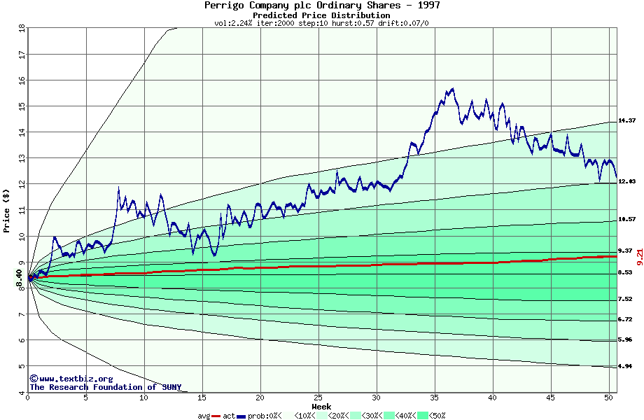 The following graph plots the year-to-date performance of the stock for 1997 compared to the probability calculated by a random walk model.