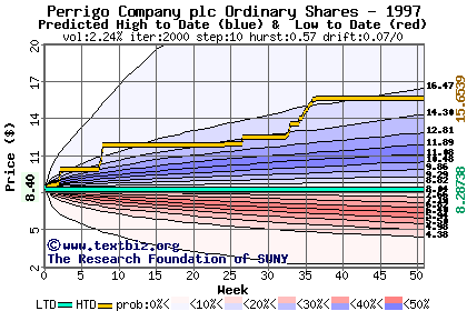 The high to date and low to date prices of the stock plotted against a random walk model for 1997 (what's this?).
