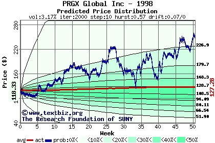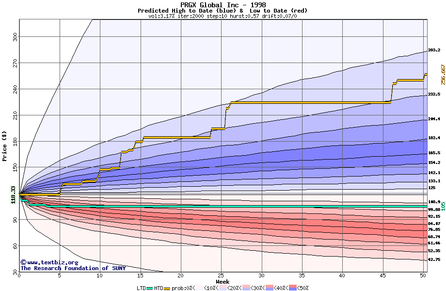 The following graph plots the year-to-date performance of the stock for 1998 compared to the probability calculated by a random walk model.