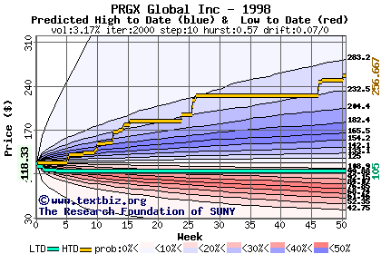 The high to date and low to date prices of the stock plotted against a random walk model for 1998 (what's this?).