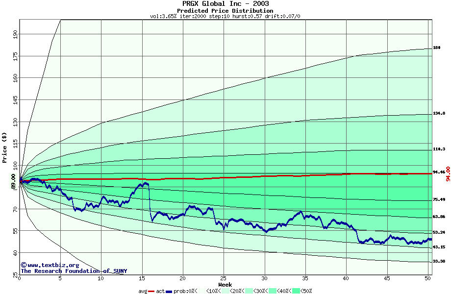 The following graph plots the year-to-date performance of the stock for 2003 compared to the probability calculated by a random walk model.