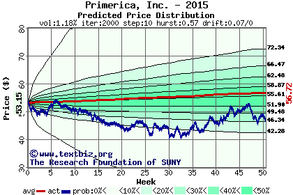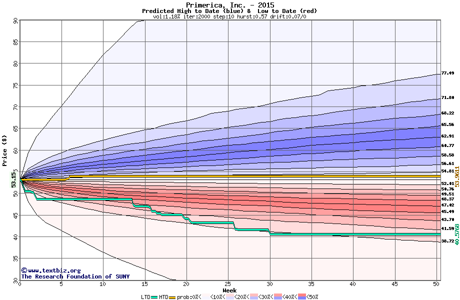 The high to date and low to date prices of the stock plotted against a random walk model for 2015 (what's this?).