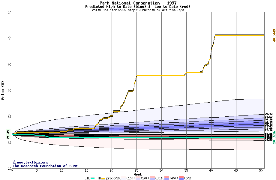 The high to date and low to date prices of the stock plotted against a random walk model for 1997 (what's this?).
