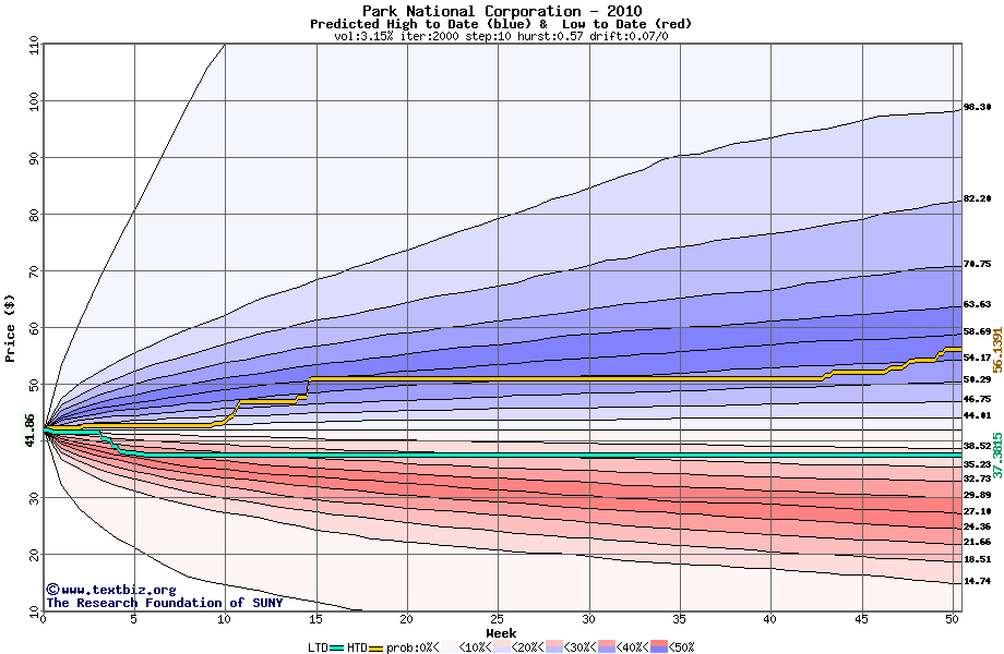 The high to date and low to date prices of the stock plotted against a random walk model for 2010 (what's this?).