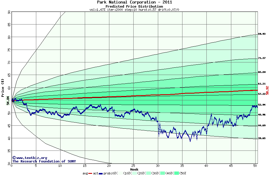 The high to date and low to date prices of the stock plotted against a random walk model for 2011 (what's this?).