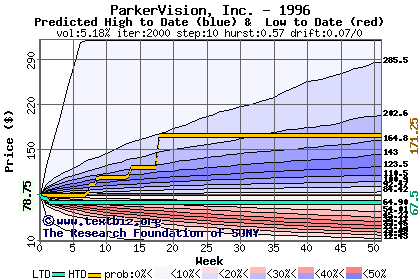 The following graph plots the year-to-date performance of the stock for 1996 compared to the probability calculated by a random walk model.