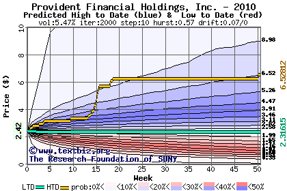 The high to date and low to date prices of the stock plotted against a random walk model for 2010 (what's this?).